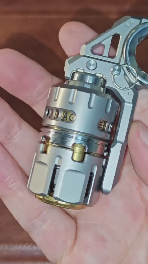 Titanium shell with brass inner liner engraved “frag smoke flash.” Weighty. Durable. Display worthy. -