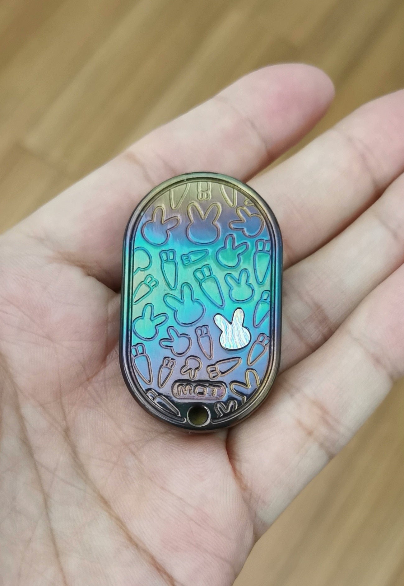 Anodic Engraving (Green/Blue/Orange Dragon) for a vibrant, colorful effect, though with slightly less refinement and minor color overflow due to the limitations of the coloring process.